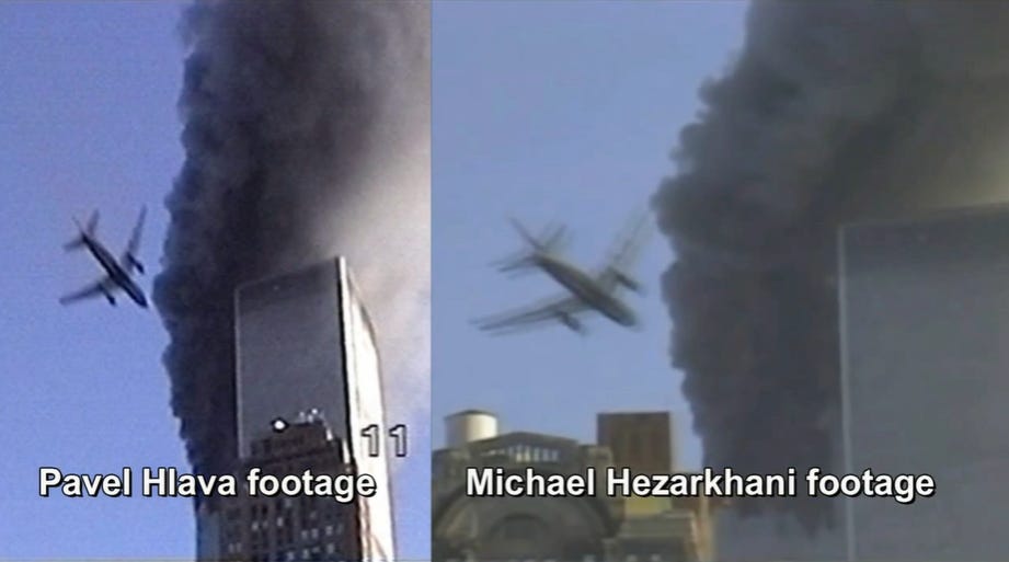 Another point which has been observed in my analysis of the September Clues film surrounding the promotion of video fakery is, that Simon Shack makes false claims about certain videos such as the Michael Hezarkhani video, where in one example he claims the Pavel Hlava 2nd plane video is a "re-edit" of the Michael Hezarkhani video footage.