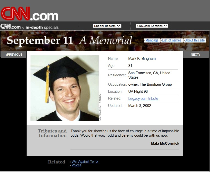Notice how it says how he was killed, 13 days before 9/11? Just who is Mark Bingham anyway? We were told that he was an openly gay man. President of his fraternity. And told that he nearly missed his flight, Flight 93. We were told the plane actually had closed its door and then reopened it to allow him to board.