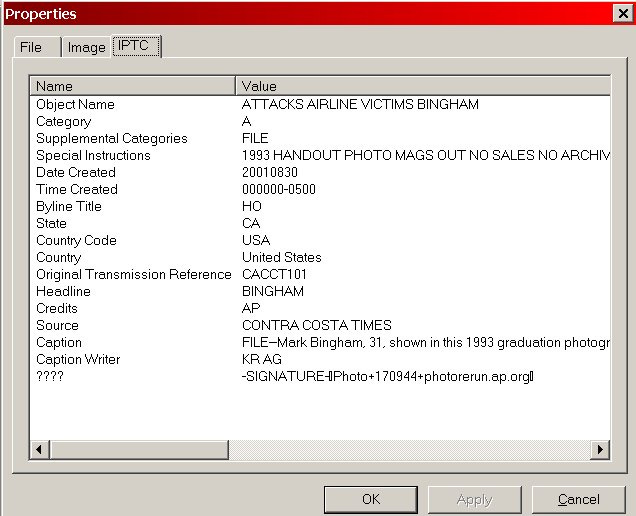 Here is a rather large blunder on the part of CNN or AP Press; Mark Bingham’s Exif/IPTC data shows as 08/30/2001.