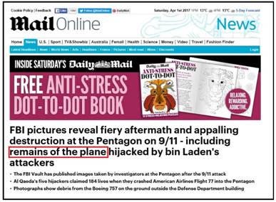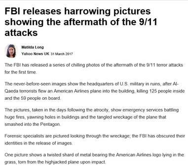 Below: samples of news headlines on 31st March 2017 and the release of FBI 9/11 Pentagon images: Please Note: I’ve highlighted in “red” font the instances of references to the plane story.