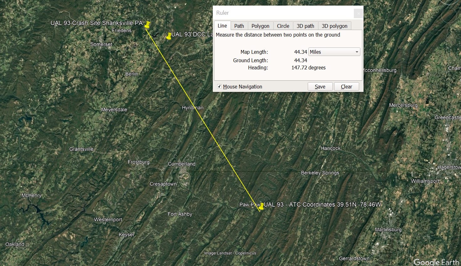 See below, plotted Lat-Long coordinates for UAL 93, placing the aircraft 44.34 miles past the alleged crash site.