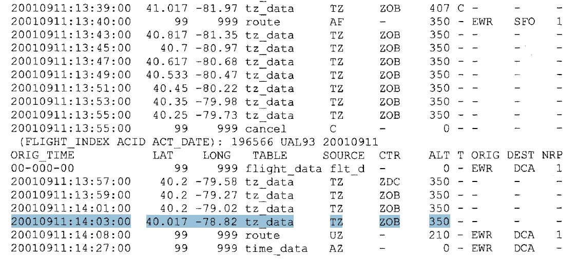 In a previous article where I conducted a full analysis of UAL 93 telemetry data, I showed conclusively that UAL 93 was still airborne well after the alleged crash time of 10:03 a.m. I outlined a number of official pieces of evidence. Below, I will now add another piece of official Dulles Control Center (DCC) radar telemetry data evidence which was originally withheld from the American public, until it was released under a Freedom of Information request.
