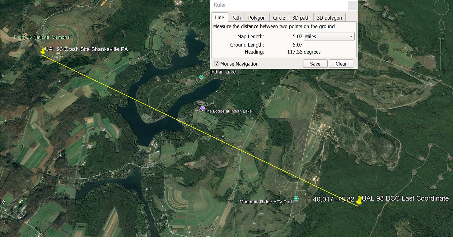 Below, shows the DCC radar data of the Lat-Long coordinates for UAL 93, which places the aircraft 5.07 miles past the “alleged” crash site in Shanksville PA.